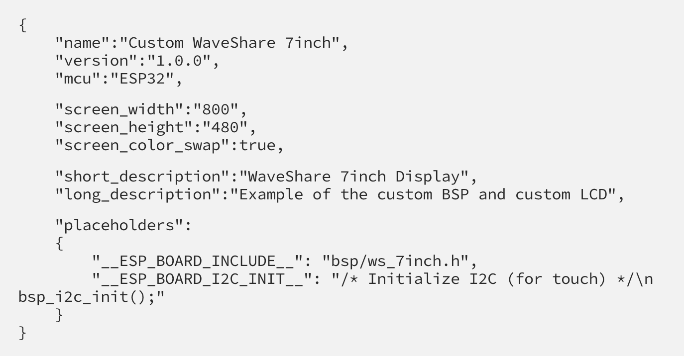 The name, version, mcu, short_description and long_description can be set to any value, since they are meant only for displaying your board correctly on SquareLine Studio. Values, such as screen_width, screen_height and screen_color_swap, are more important, since they define the physical parameters of your LCD. The placeholders should be updated with the right values from your customized BSP; likewise, the header file path should change to __ESP_BOARD_INCLUDE__ and the touch screen initialization function to __ESP_BOARD_I2C_INIT__.