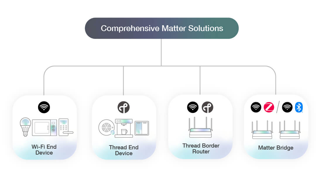 Espressif は、CSA (Connectivity Standards Alliance) のアクティブメンバーとして、Matter 規格の初期段階からその開発に参画し、規格の普及に積極的に取り組んでいます。無線通信 SoC、ソフトウェア、および包括的なソリューションを組み合わせることで、開発者が Matter 対応のスマートホームデバイスを容易に構築できるよう支援しています。Espressif は、Matter over Wi-Fi エンドデバイス、Matter over Thread エンドデバイス、Thread ボーダールーター、および Matter ゲートウェイを含む、幅広い Matter ソリューションとリファレンスデザインを提供しています。