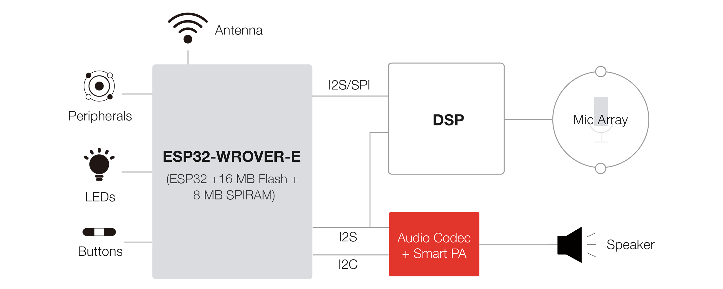 - Includes ESP32-WROVER-E module and DSP Group’s DBMD5P Audio SoC