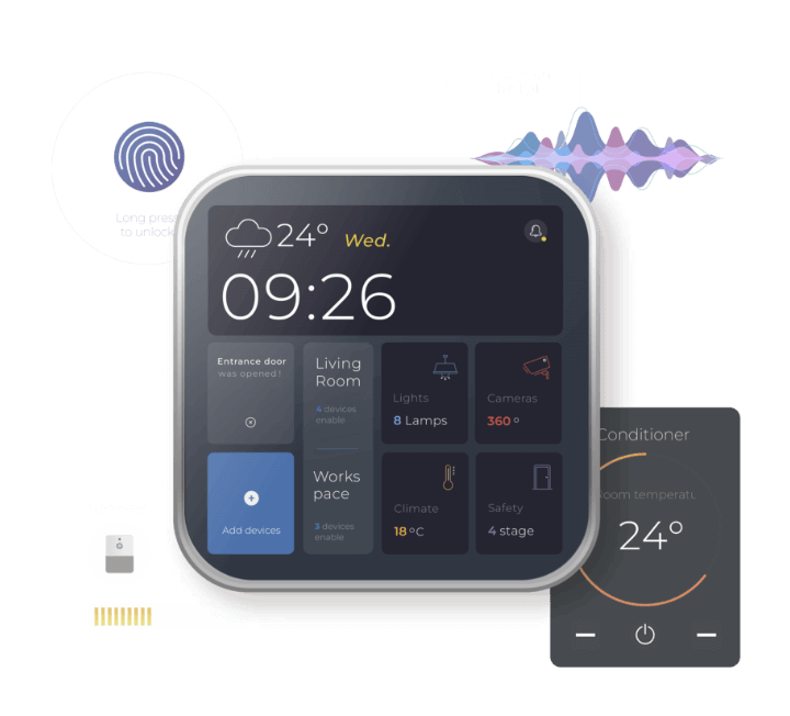 RGB is a common driver interface for smart-home control, because of its high refresh rate and ability to drive large screens. ESP32-P4 and ESP32-S3 are well-suited for RGB interface LCDs. They support various peripherals which can be used for building a remote control hub or smart-home panels controlling different devices, switches, scenes, temperatures, etc. Equipped with a dual-core CPU with powerful Al features, ESP32-P4 and ESP32-S3 offer effortless touch experience, smooth GUI response, and effective online/offline voice interaction.