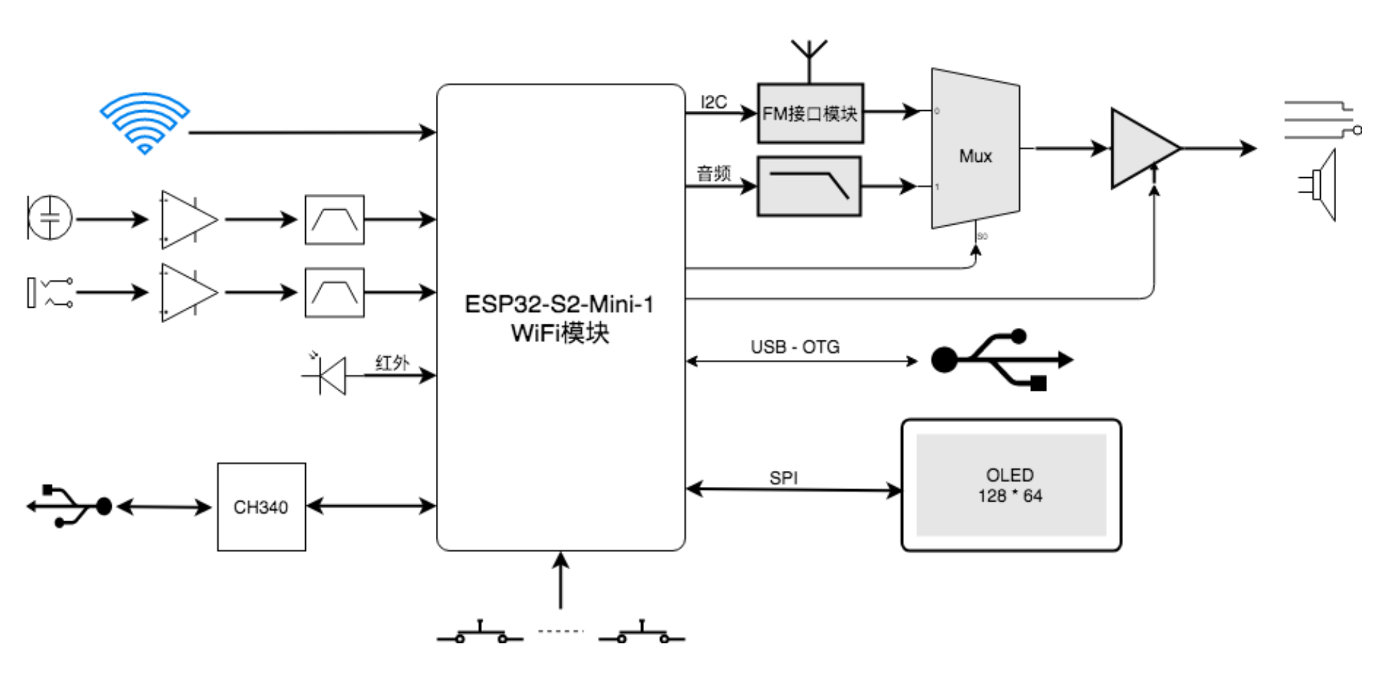 • 一个模拟开关,用于切换来自 ESP32-S2 产生的音频或 FM 输出的音频,模块开关的输出会送至喇叭或耳机进行输出